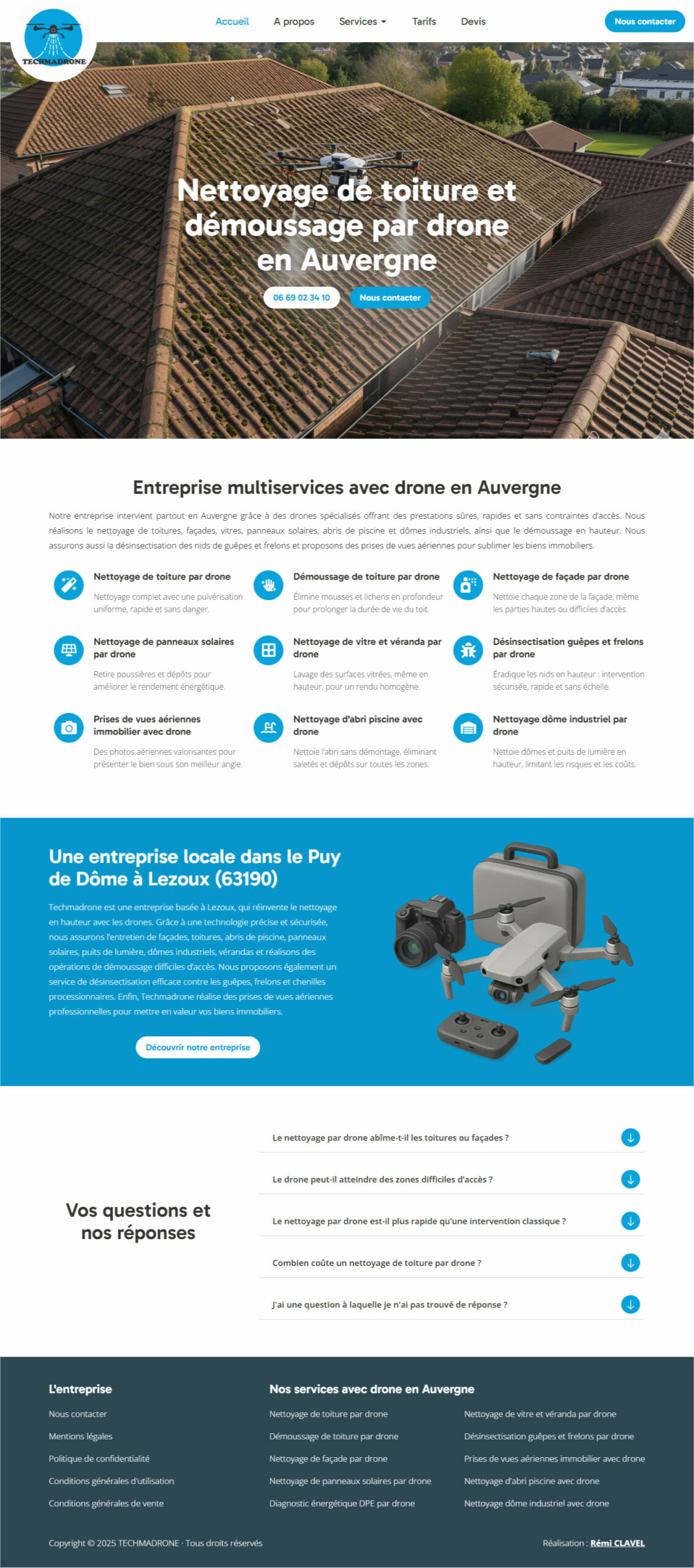 Techmadrone réalise le nettoyage de toitures, façades, vitres, panneaux solaires, abris de piscine et dômes industriels, le démoussage en hauteur, la désinsectisation de nids de guêpes et frelons, ainsi que des prises de vues aériennes pour mettre en valeur les biens immobiliers.